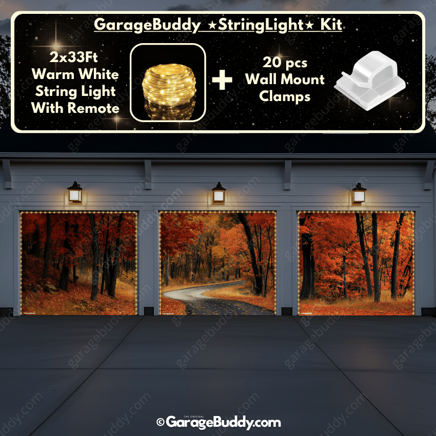 Enhance your Autumn Garage Door Cover with the optional GarageBuddy string light kit—now available at 50% off and turn your garage into a true autumn glow! The kit includes 1x 33ft warm white string light, a remote control, and 10x sticky wall mount clamps. The 2-door garage option comes with 2 string light kits. The lights work on three AA batteries (not included), so you don't need to run around finding electrical outlets.