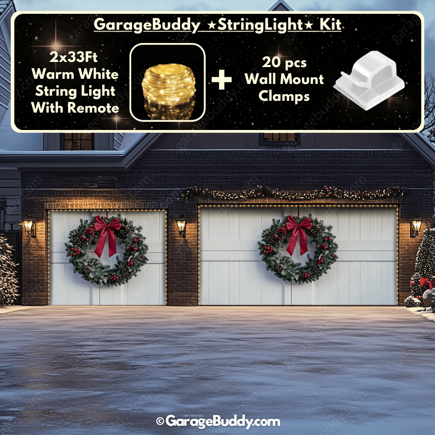 You now have the option to add the GarageBuddy string light kit to your order at 50% off and turn your garage into a true showstopper. Combine your festive garage door cover with sparkling outdoor Christmas lights for maximum holiday curb appeal. The kit includes a 33 ft warm white string light, remote control, and 10 sticky wall-mount clamps. The 2-door garage option comes with two kits. The lights run on 3 AA batteries (not included), so you won’t need to hunt for outlets.