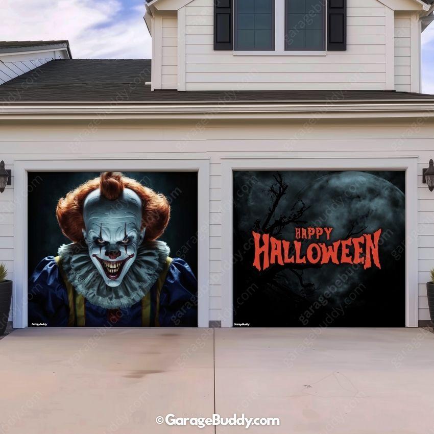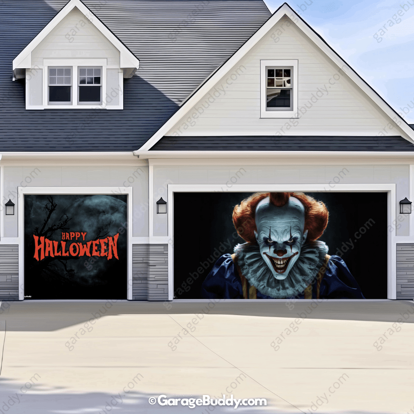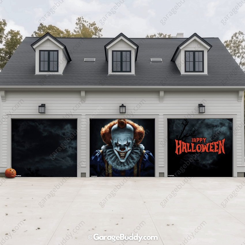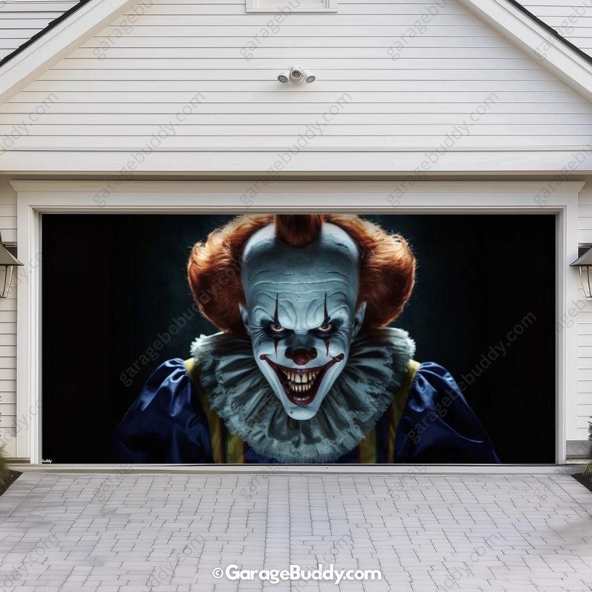 Featuring a close-up of a terrifying clown with a malevolent grin and unsettling gaze set against a shadowy background, this Creepy Clown Halloween Garage Door Cover captures pure horror. It’s designed to send chills down the spines of all who pass by, making it the ultimate spooky garage decoration idea for Halloween night!