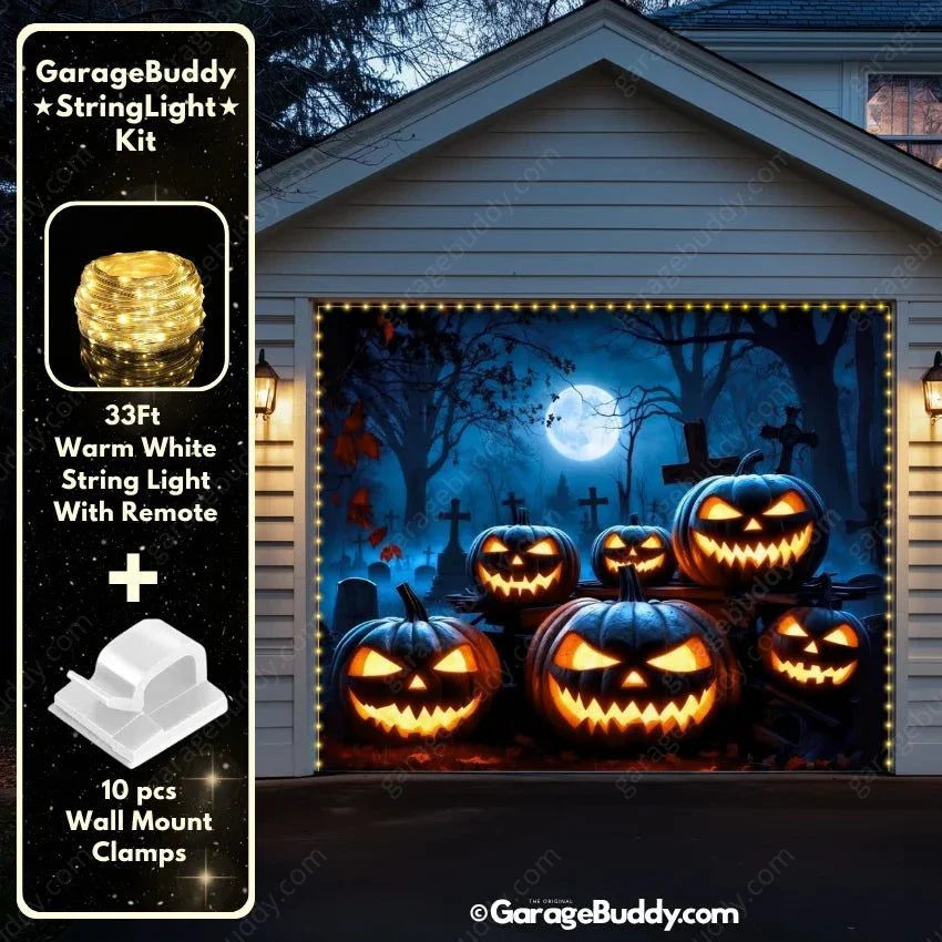 You now have the option to add the GarageBuddy string light kit to your order at 50% Off and turn your garage into a true show stopper. The kit includes 1x 33 ft warm white string light, a remote control, and 10x sticky wall mount clamps. The 2-door garage option comes with 2 string light kits. The lights work on three AA batteries (not included), so you don't need to run around finding electrical outlets. It’s the perfect companion to your Spooky Garage Door Cover, making your outdoor Halloween decorations glow with chilling charm.