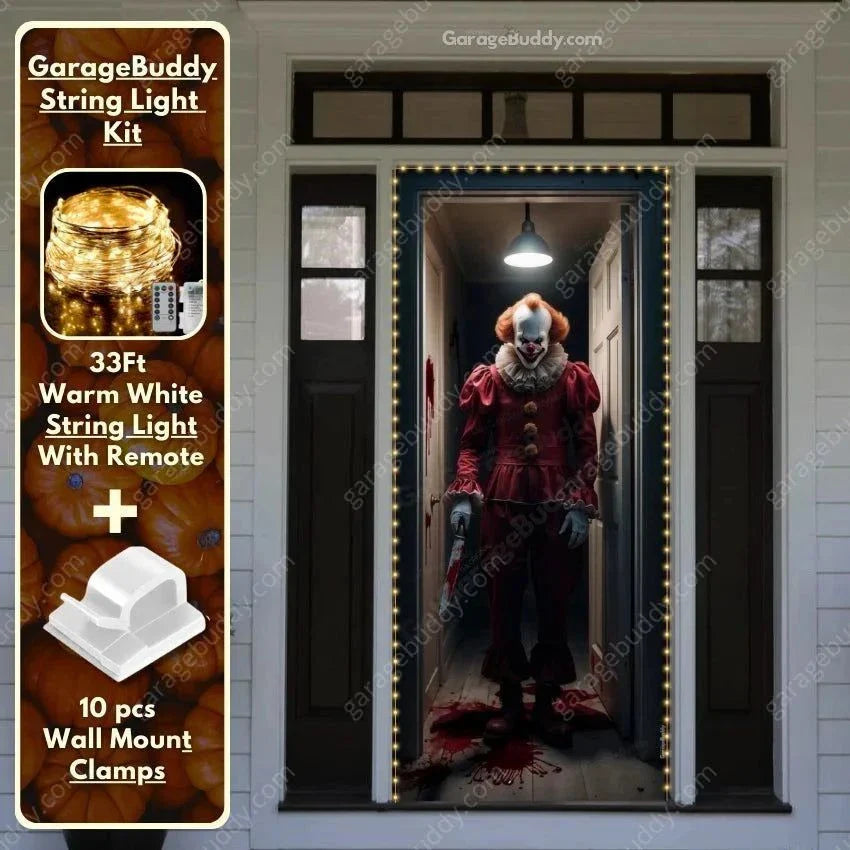 This Halloween, unleash pure fright with the Doorway Clown Halloween Front Door Cover—a decoration more sinister than ever. Featuring a menacing clown lurking at your entryway, this Halloween front door cover will make trick-or-treaters think twice before knocking! Perfect as part of your front door Halloween decorations, it instantly transforms your porch into a haunted scene.