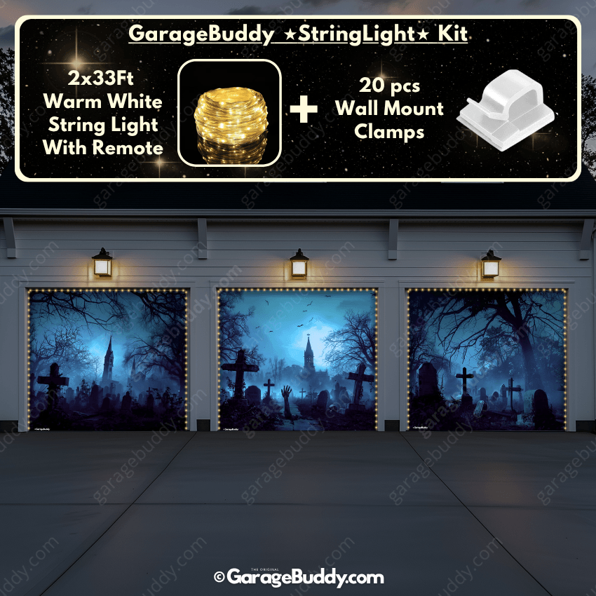 You now have the option to add the GarageBuddy string light kit to your order at 50% off and turn your garage into a true showstopper. The kit includes 1x 33 ft warm white string light, a remote control, and 10x sticky wall mount clamps. The 2-door garage option comes with 2 string light kits. The lights work on three AA batteries (not included), so you don't need to run around finding electrical outlets. Perfect for layering with your outdoor Halloween decorations for maximum effect.