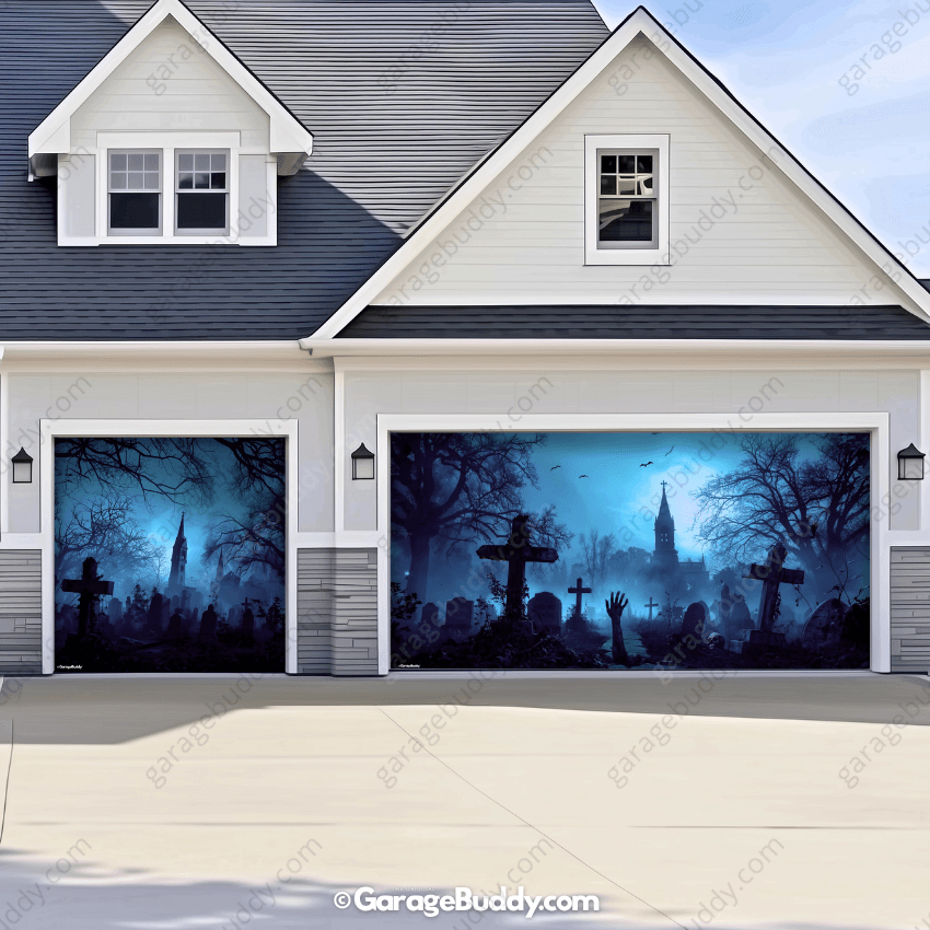 The grave can’t hold them forever! With a hand bursting through the earth under a moonlit sky, this Grave Rising (Glow) Halloween Garage Door Cover sets the scene for a night of fright you’ll never forget. Perfect for creating spooky Halloween decorations that instantly transform your home exterior into a haunted spectacle.