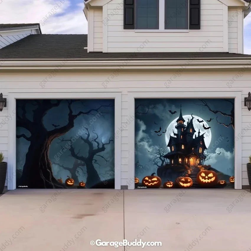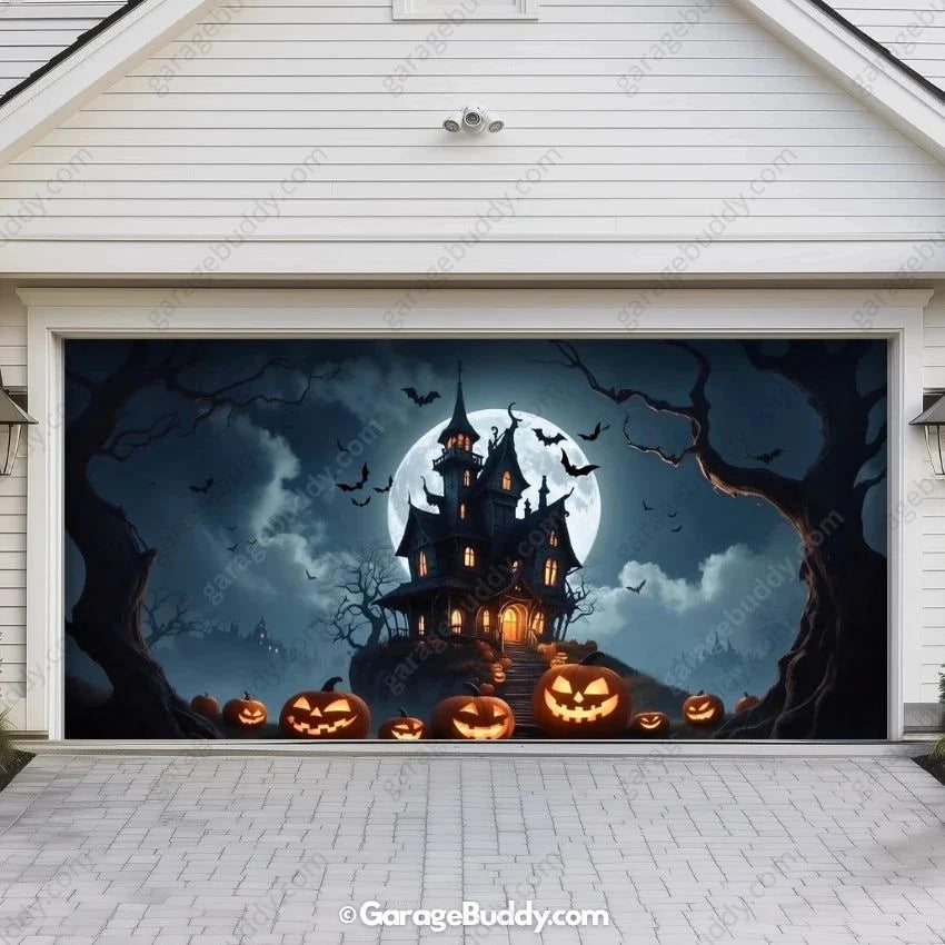 The Haunted House Halloween garage door cover pulls you in like a horror movie freeze-frame: a crooked house on a hilltop, fog creeping through dead trees, and bats escaping into the sky. It’s calm. It’s eerie. It’s exactly what your garage needs to become Halloween canon with a Halloween garage door cover that transforms your space into a chilling spectacle.