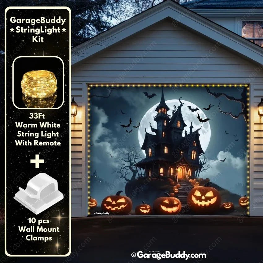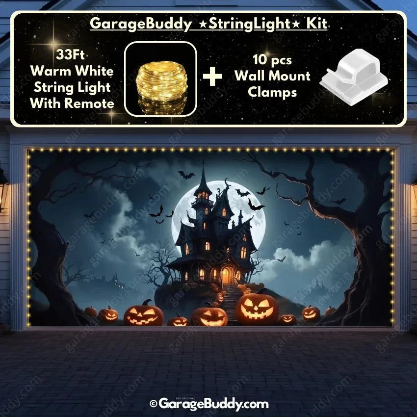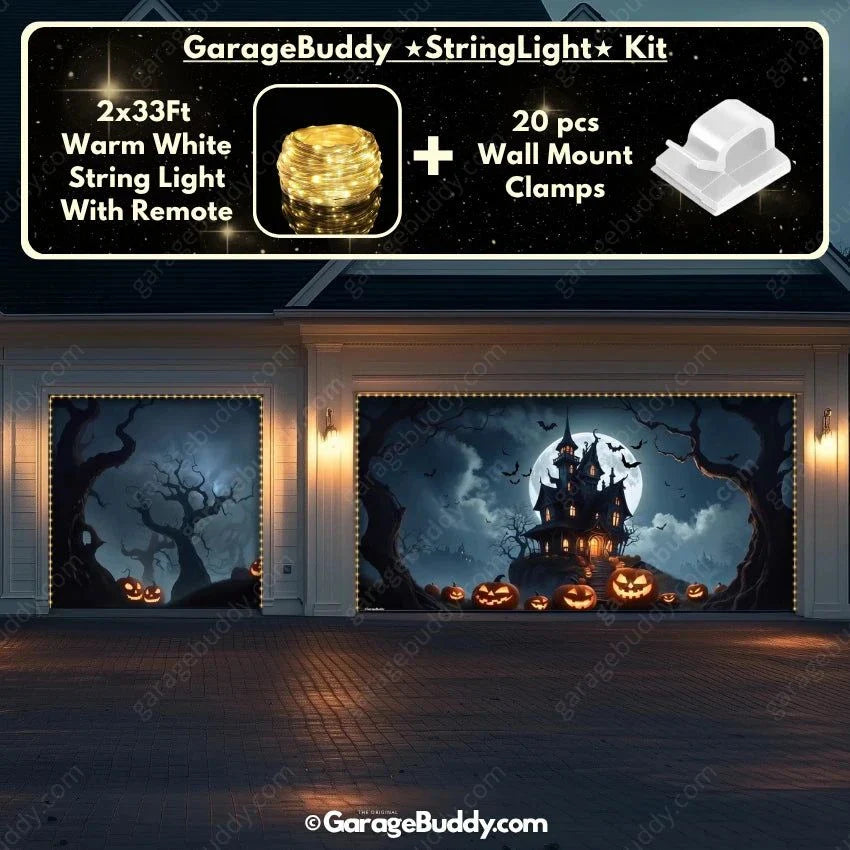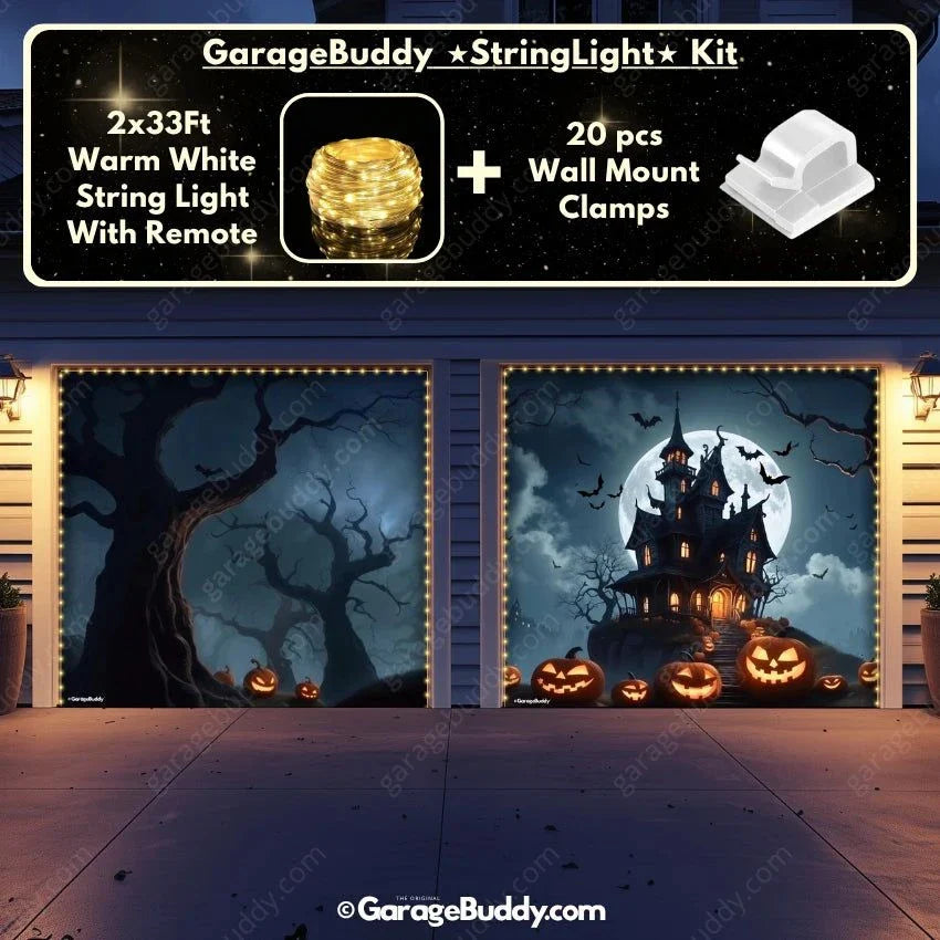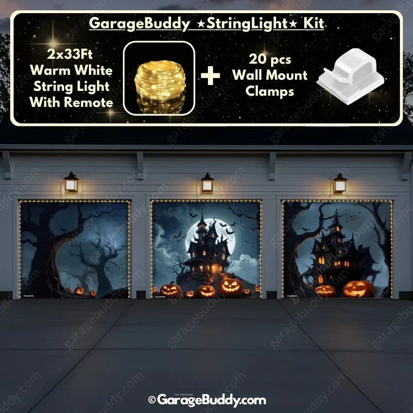 You now have the option to add the GarageBuddy string light kit to your order at 50% Off and turn your garage into a true showstopper. Pairing your lights with a spooky Halloween garage door cover makes your house the highlight of the street. The kit includes 1x 33 ft warm white string light, a remote control, and 10x sticky wall mount clamps. The 2-door garage option comes with 2 string light kits. The lights work on three AA batteries (not included), so you don’t need to run around finding electrical outlets. Perfect for pairing with your Spooky Garage Door Cover or other outdoor Halloween decorations.
