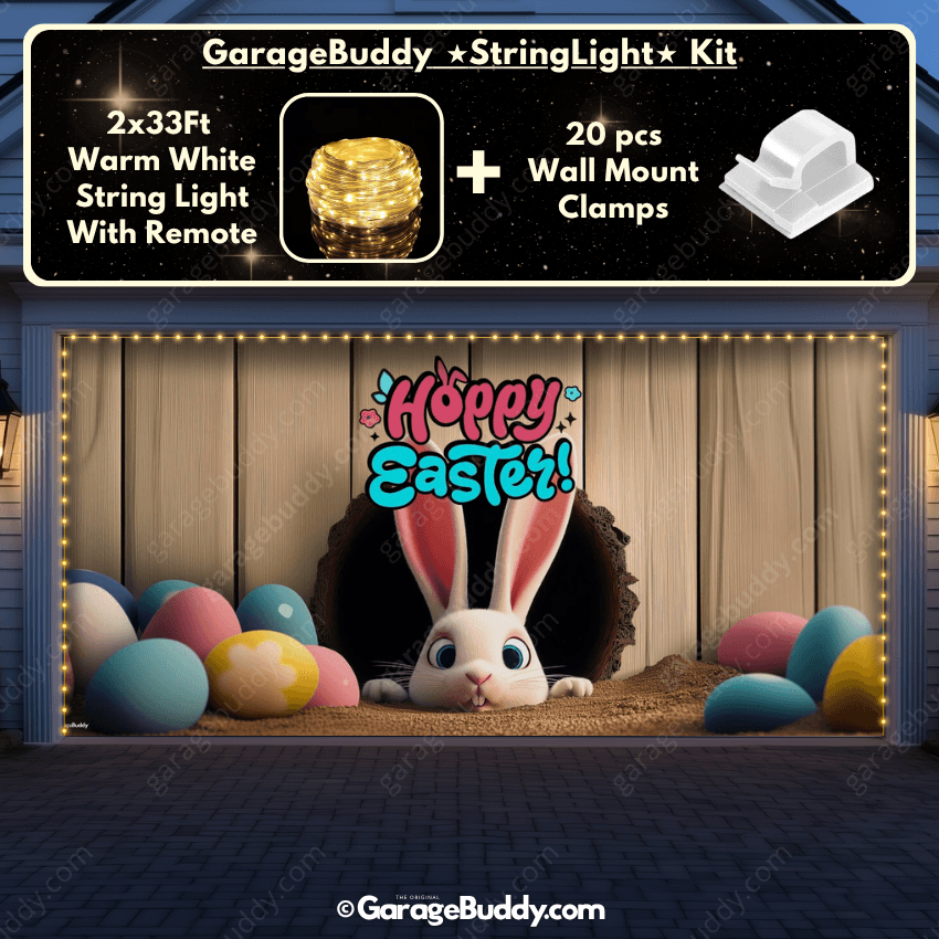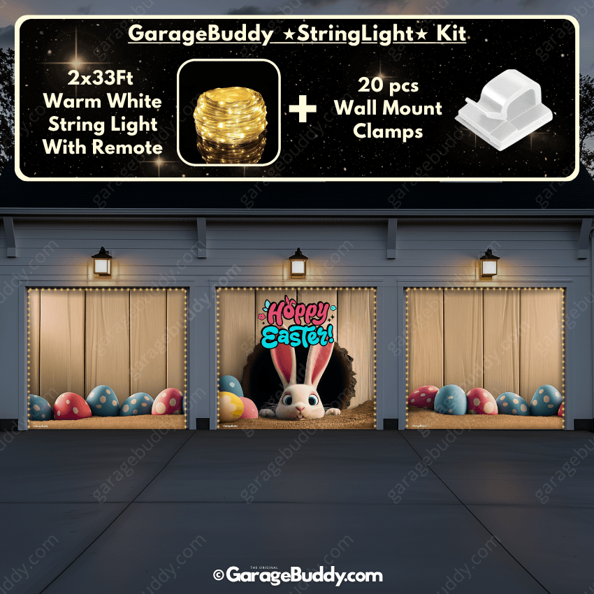You now have the option to add the Garagebuddy string light kit to your order at 50% off and make your Easter setup truly shine. The kit includes 1x 33 ft warm white string light, a remote control, and 10x sticky wall mount clamps. The 2-door garage option comes with 2 string light kits. The lights work on three AA batteries (not included), so you don't need to run around finding electrical outlets.
