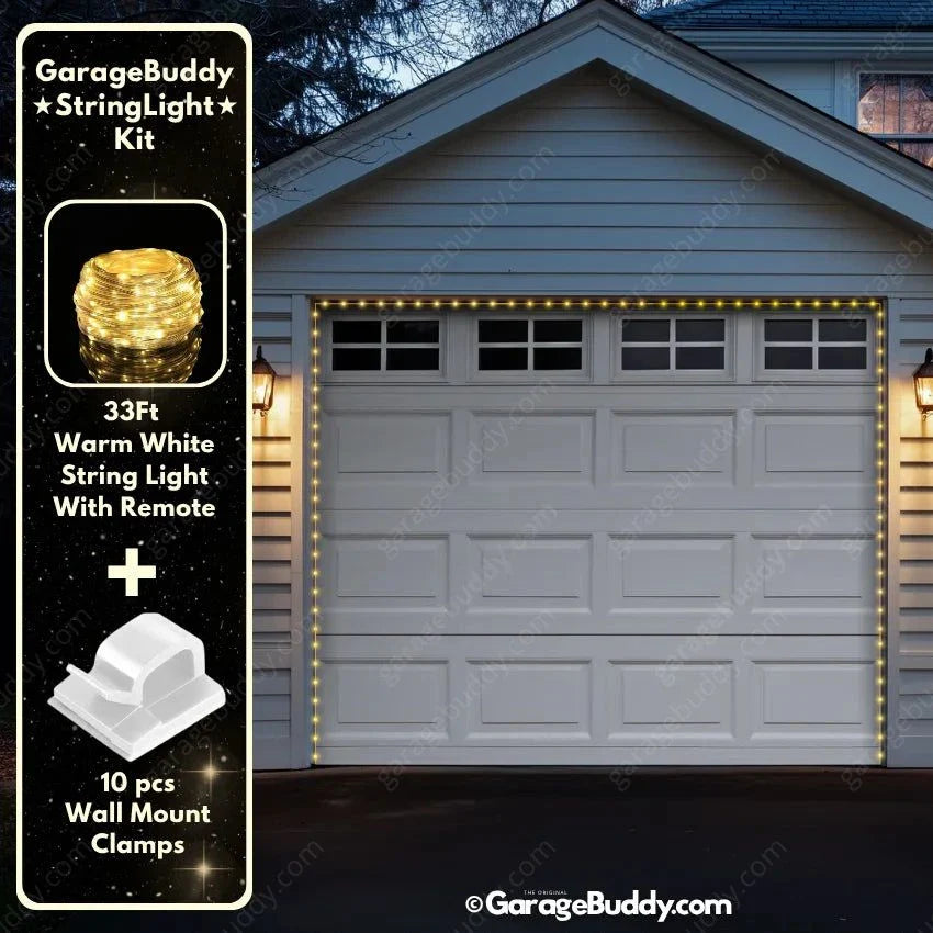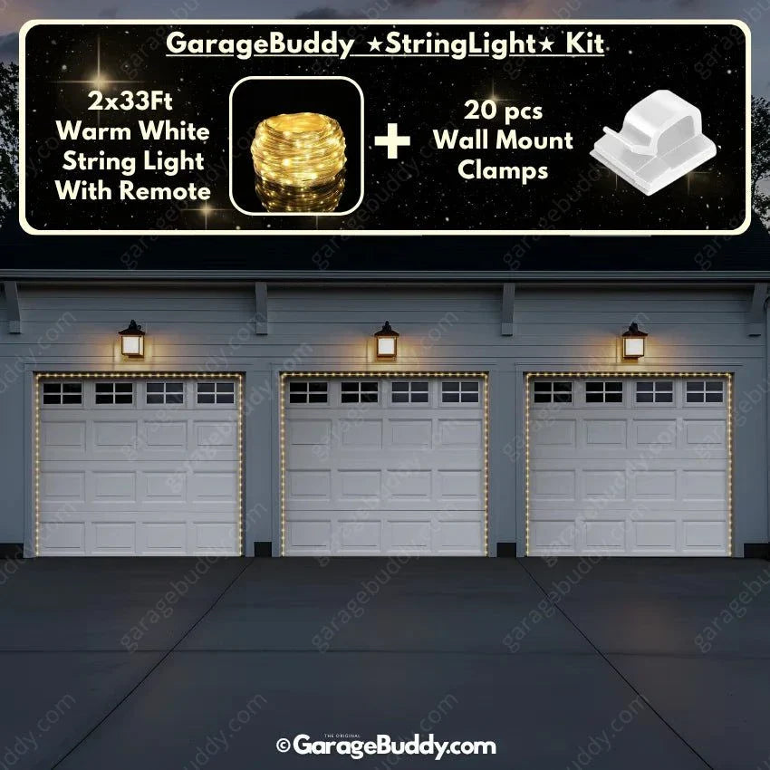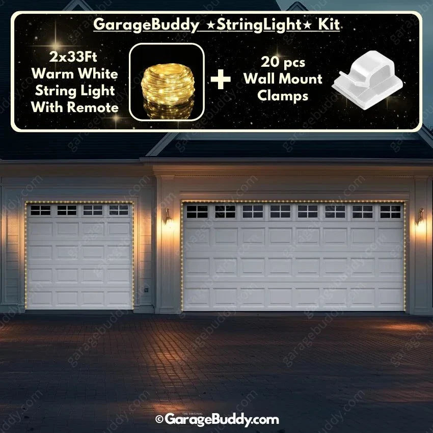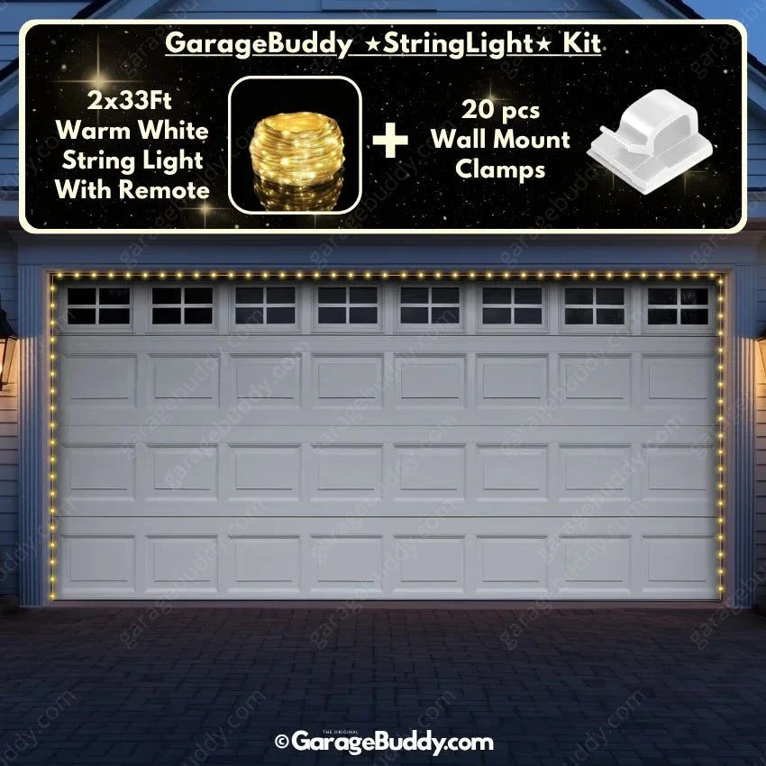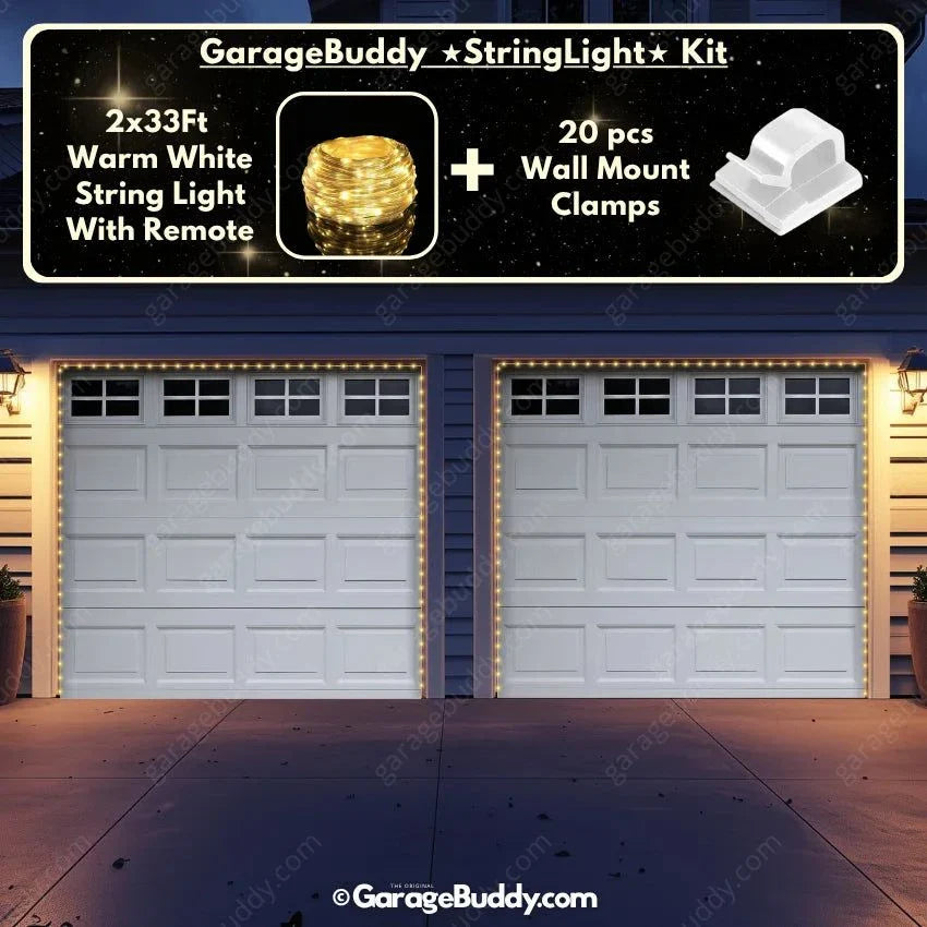You now have the option to add the GarageBuddy string light kit to your order at 50% Off and turn your garage into a true show stopper. The kit includes 1x 33 ft warm white string light, a remote control, and 10x sticky wall mount clamps. The 2-door garage option comes with 2 string light kits. The lights work on three AA batteries (not included), so you don't need to run around finding electrical outlets.