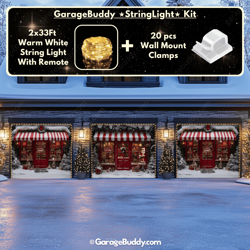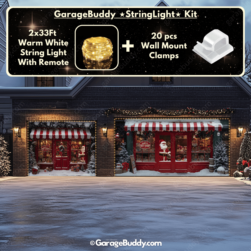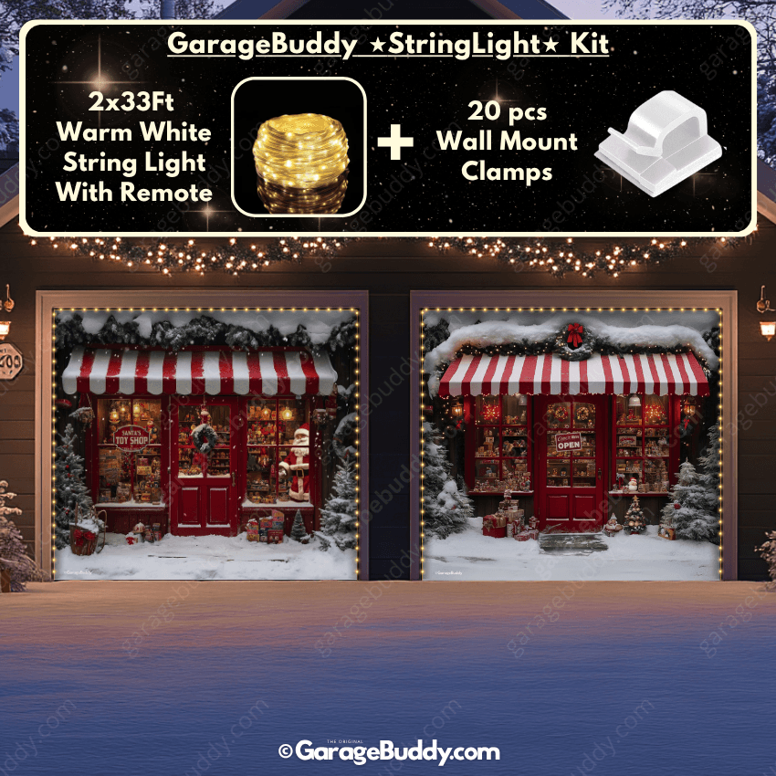Now you can elevate your holiday display with our GarageBuddy string light kit—available at 50% off! Pair your Christmas Garage Door Cover with glowing outdoor Christmas lights and turn your garage into a true showstopper. The kit includes 1x 33 ft warm white string light, a remote control, and 10x sticky wall mount clamps. The 2-door garage option comes with 2 light kits. Since the lights work on three AA batteries (not included), you won’t need to scramble for outlets.