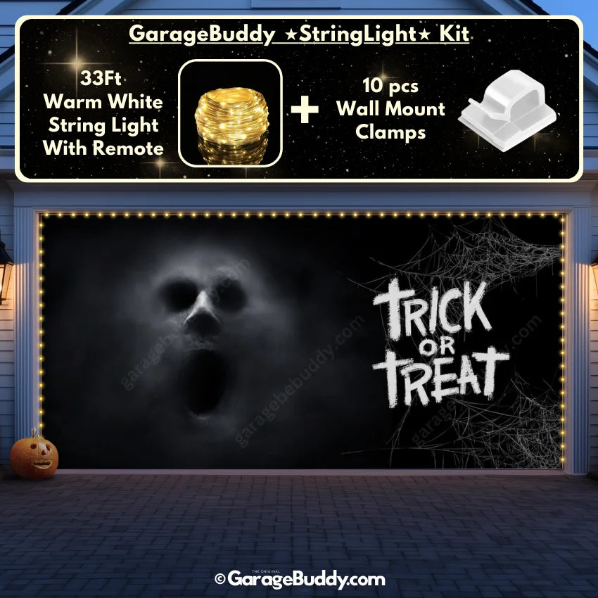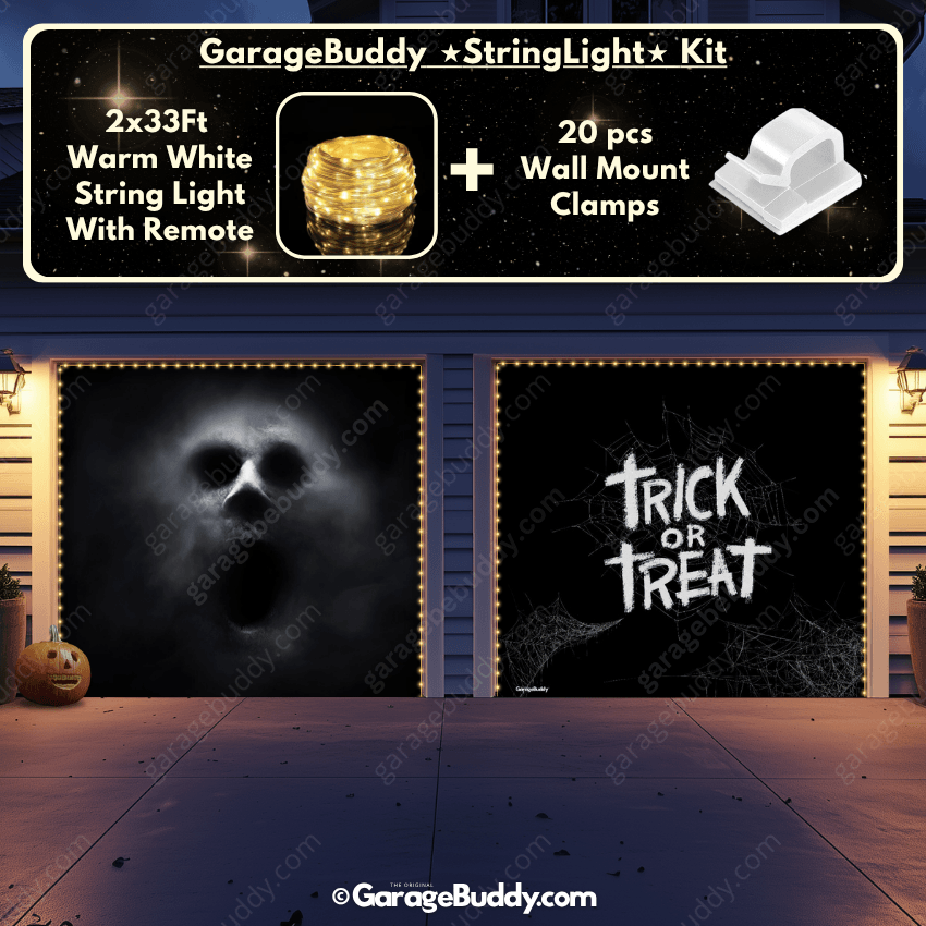 You now have the option to add the GarageBuddy string light kit to your order at 50% off and turn your Halloween garage decorations into a true showstopper. The kit includes 1x 33 ft warm white string light, a remote control, and 10x sticky wall mount clamps. The 2-door garage option comes with 2 string light kits. The lights work on three AA batteries (not included), so you don’t need to run around finding electrical outlets—making your Halloween garage door cover glow creepier than ever.