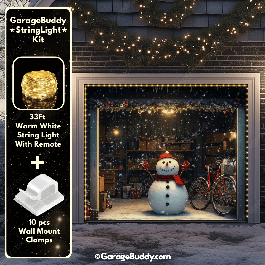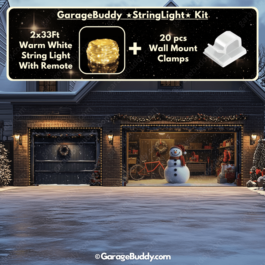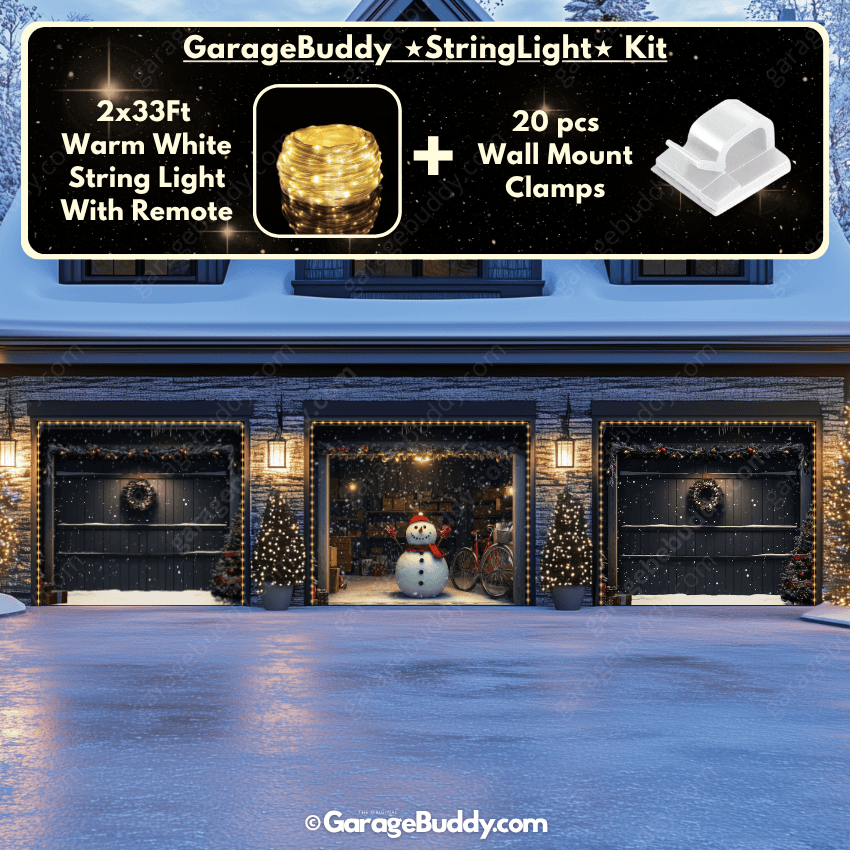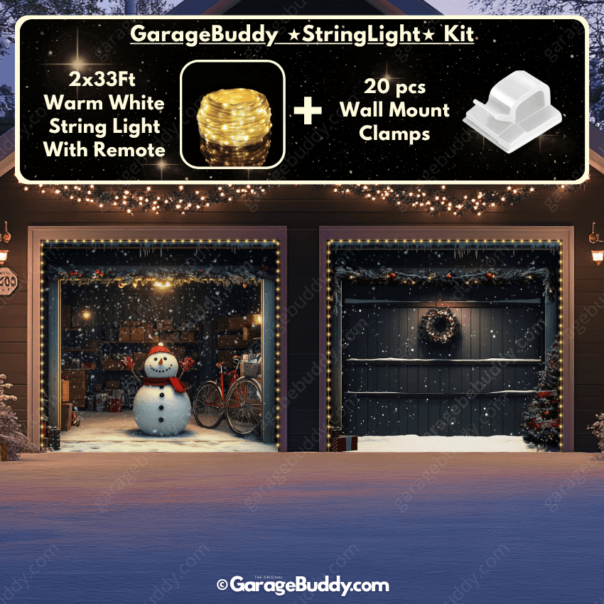 You now have the option to add the GarageBuddy string light kit to your order at 50% off and turn your garage into a true showstopper. Pair your Christmas garage door cover with twinkling outdoor Christmas lights to create a magical display that neighbors won’t forget. The kit includes 1x 33 ft warm white string light, a remote control, and 10x sticky wall mount clamps. The 2-door garage option comes with 2 string light kits. The lights work on three AA batteries (not included), so there's no need to worry about finding outlets.