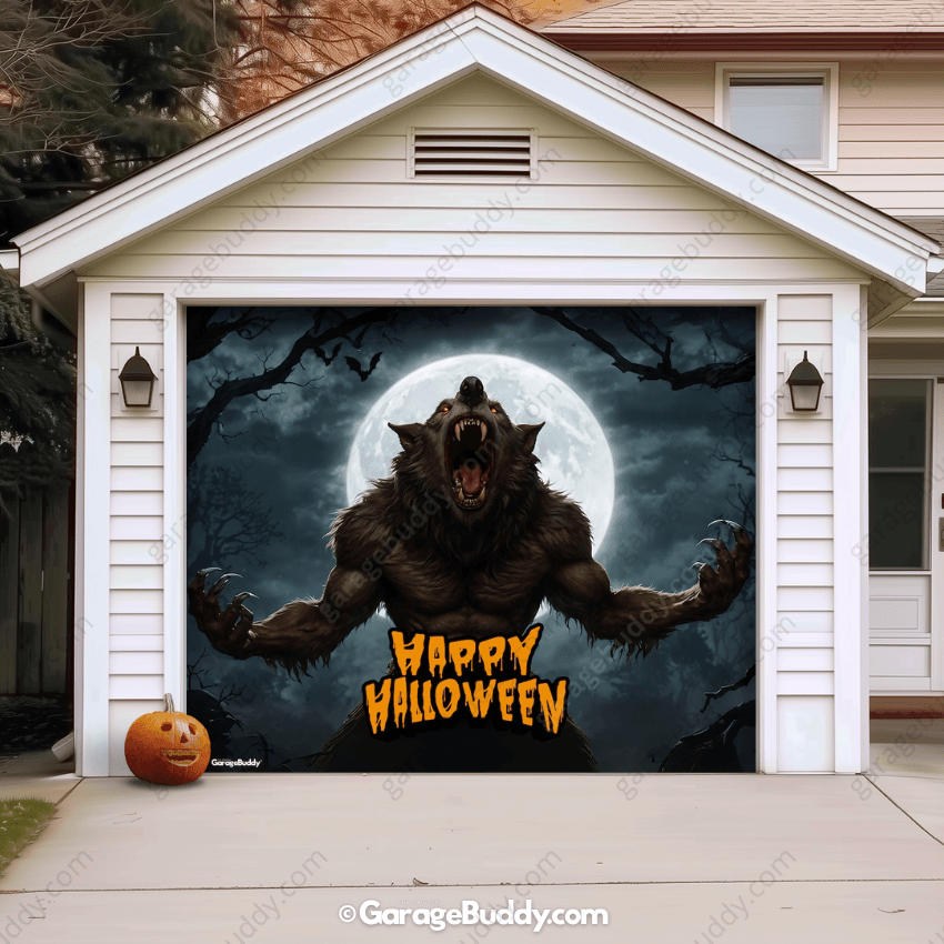 Unleash the beast with a Werewolf Scene Halloween Garage Door Cover! This heart-pounding design features a colossal werewolf growling menacingly in a shadowy forest. A ghostly full moon bathes the scene in eerie light, enhancing the werewolf’s fearsome presence and transforming your garage into a chilling nocturnal nightmare. This spooky garage door cover instantly makes your house the star of the neighborhood.