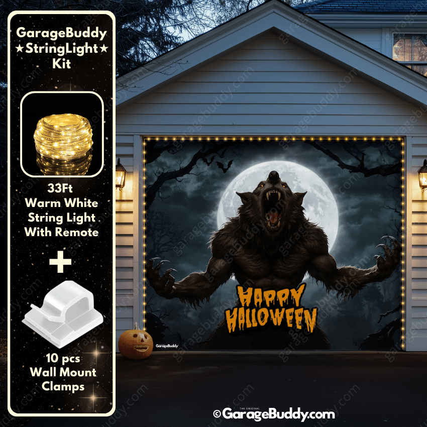 You can now add the GarageBuddy string light kit to your order at 50% off and turn your haunted display into a true showstopper. The kit includes 1x 33 ft warm white string light, a remote control, and 10x sticky wall mount clamps. The 2-door garage option comes with 2 string light kits. The lights work on three AA batteries (not included), so you don’t need to run around finding electrical outlets. Combine them with your creepy garage door cover for the ultimate haunted house vibe.