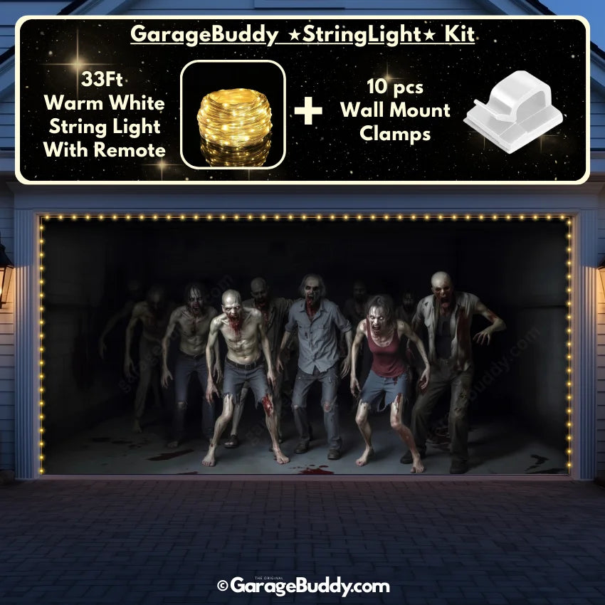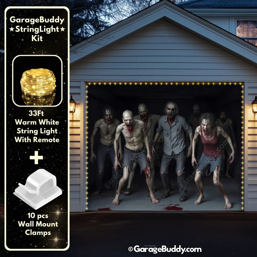 Take your Halloween outdoor decoration ideas to the next level! You can now add the GarageBuddy string light kit to your order at 50% Off and make your garage a true showstopper. The kit includes 1x 33 ft warm white string light, a remote control, and 10x sticky wall mount clamps. The 2-door garage option comes with 2 string light kits. The lights work on three AA batteries (not included), so you don't need to run around finding electrical outlets. Pair it with a Spooky Garage Door Cover for a haunted look that glows all night.